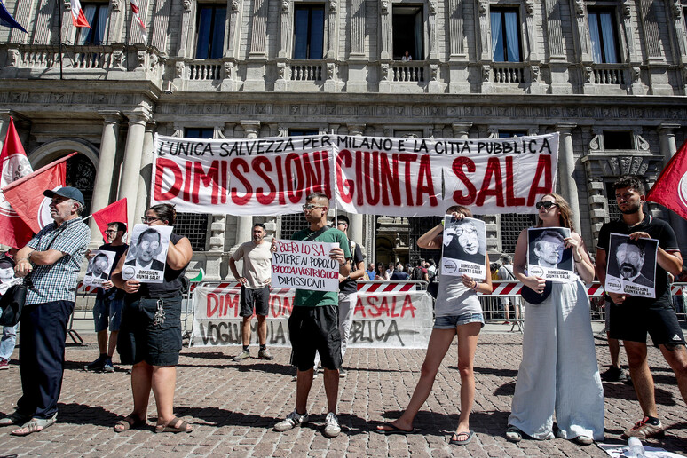 Protesta in piazza Scala,davanti alla sede del Comune di Milano,per chiedere le dimissioni della giunta guidata dal sindaco Giuseppe Sala,che a breve riferirà in aula del Consiglio comunale dopo la notizia dell'indagine a suo carico nelle inchieste dell'urbanistica.